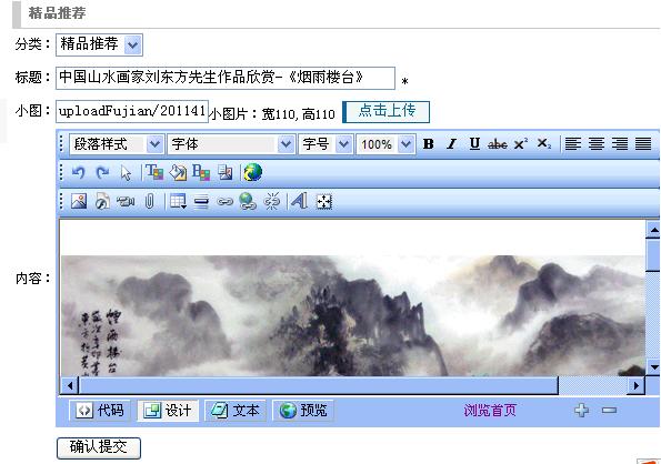 一、请您先在“小图”上传窗口按提示程序上传作品图片,您在这个窗口上传的图片将显示在您网页的首页栏目里;
