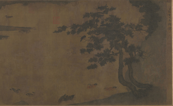 此图为开阔的平远式构图,远景汀渚曲折,垂柳弄阴,一派仲夏景象;中景为辽阔的水面,有白鹭、野凫、鸳鸯等水禽嬉戏波间,富有情趣;近景绘高大的苍松,枝繁叶茂,一派生机。图中树木用宋人普遍运用的夹叶法表现,茂密的树叶为笔法工整的双勾填色,枝叶相互叠加,既有层次感又不失之于琐碎。此图所绘一湖两岸的小景致虽然缺少李唐、范宽高远式取景的壮美,然亦不乏田园诗的意境。