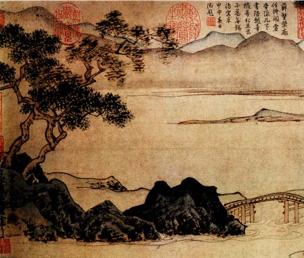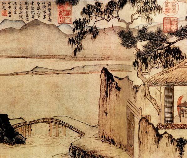此图为别号图,是周臣为一位裴姓,号春泉的文人所作。画面起首以裴君的草堂为中心展开,草堂轩敞明亮,陈设简洁,堂外古松盘曲。主人正伏案假寐,堂外一童子持帚清扫,体现出闲雅出尘之趣。其后,板桥连岸,春水潺湲,远处青山逶迤,平湖无涯。中国画中往往绘文人隐士昼眠以示对外界的漠不关心,暗示他们与作官者有不同的享受,宣扬自我解脱、自我慰籍的处世哲学。画家巧妙地突出近景的板桥流水,以示“春泉”之意,又以假寐表示“小隐”,点明主题。