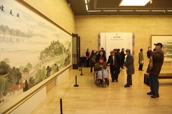 展出作品中既有反映北京早期自然生态环境的巨幅作品《燕蓟形胜图》;也有反映北京近现代历史文化风貌的巨幅作品《古都揽胜》、《南囿秋风》、《圆明神韵图》;还有反映颐和园、北海、香山、长城等文人景观的四幅巨幅作品《颐和春色》、《盛夏琼华》、《香山秋韵》、《雄关冬雪》。这些作品皴擦点染,悉依传统、经营位置,点景设色,参中酌西,将文史和美术结合,中西结合、传统和创新结合,展示了北京历史文化的丰富内涵,展示了中国山水画的无穷魅力。