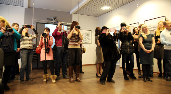 2014中俄冰雪画展代表团团长、冰雪画创始人于志学、黑河市副市长范志国、黑河市文化广电新闻出版局局长常玉辉、符拉迪沃斯托克副市长叶列娜•鲍里索芙娜、符拉迪沃斯托克国立经济服务科学院副院长奥克桑娜•奥列格夫娜•玛尔特耐克、符拉迪沃斯托克国立经济服务科学院展览馆美术评论家奥丽亚• 佐多娃、俄罗斯滨海边疆区画协主席布都索夫•依万诺维奇、俄罗斯功勋画家乌苏里斯克画家协会特卡琴科•阿列克桑德尔•瓦西里耶维奇、俄罗斯功勋画家乌苏里斯克画家协会奥利加•尼斯特奇克、海参崴画家协会会员奥斯波维•叶夫根尼、奥斯波维•奥克桑娜、利达•果兹米娜、阿列克桑德尔•阿尔谢尼卡、乌苏里斯克画家利斯特罗沃依•弗拉基米尔、依万•尼基特奇克、特卡琴科•亚历山大、布拉戈维申斯克市画家协会会员兹维列夫•热尼亚及中国冰雪画派数十名画家、当地美术院校学生、留学生、美术爱好者、新华社海参崴分社和当地媒体二百余人参加了画展开幕式。开幕式由符拉迪沃斯托克国立经济服务科学院展览馆美术评论家奥丽亚.佐多娃主持人,符拉迪沃斯托克副市长叶列娜•鲍里索芙娜、符拉迪沃斯托克国立经济服务科学院副院长奥克桑娜•奥列格夫娜.玛尔特耐克、黑河市副市长范志国、冰雪画创始人于志学分别在开幕式致辞。