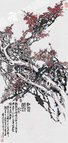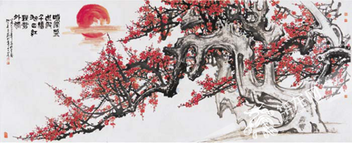 朱宣咸中国画《旭日红梅》(画上题款:时逢盛世迎千禧,旭日红花分外娇)