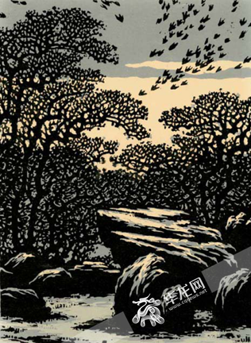 朱宣咸新兴木刻版画《群雀归林》 1990年代