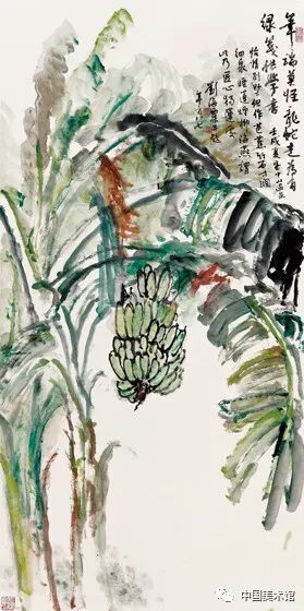 中国画《芭蕉》以没骨法画成,芭蕉枝叶全用书法用笔的方式写出,笔力雄强,厚重老辣。线条繁而不乱,气韵回荡其中。画面彩墨淋漓,鲜艳欲滴,显示了刘海粟非凡的大写意才情和胸有成竹的精准把握。这得益于他的泼墨泼彩在恣肆汪洋、放达无羁中形成的天姿风骨,也得益于他那圆融浑朴、凝重苍茫、具有钟鼎石鼓之趣的中锋运笔和以书入画的笔法意趣。