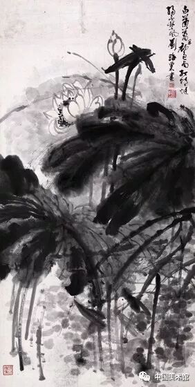 刘海粟喜以泼墨、泼彩之法画荷花,在大片泼墨、泼彩形成荷叶之后,再补以花瓣、荷茎、浮萍等,构成色块与线条的互动。《白菡萏开初过雨》是刘海粟泼墨大写意荷花的代表之作。题款云:“白菡萏开初过雨,红蜻蜓弱不禁风。刘海粟画。”此作以泼墨、积墨等手法,营造出水墨变幻之境,浓、淡、干、湿,自然渗化,变化无穷,凸显了作者高超的笔墨驾驭能力与雄阔的情怀。