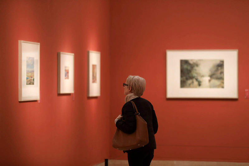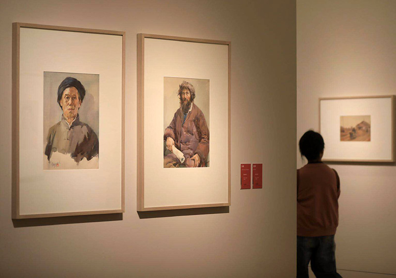 一名观众观看展览作品。今年是杨云龙诞辰100周年,他的后人将其一生各个阶段创作的45件水彩画精品捐赠给中国美术馆。