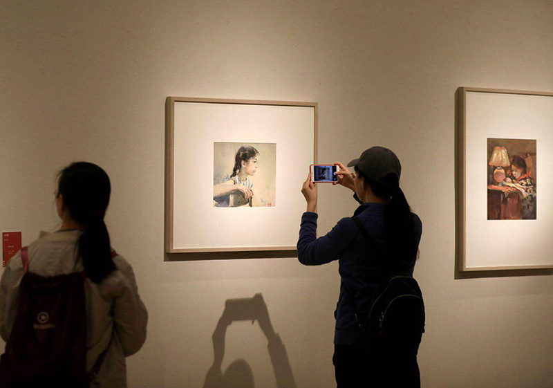 观众在拍摄纸本水彩《三女儿罗丹》。