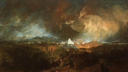 3000多年后,一位英国画家——约瑟夫·马洛德·威廉·透纳画出了《埃及的第五次瘟疫》,在那幅完成于1800年的画作里,地平线从中一分为二,上半部是天空,浓重、旋转的笔触,加上不同色度的褐、赭和浓黄色,形成一团巨大的云涡;下半部是灾难洗劫后的大地,一片焦土色在中景轮廓清晰的金字塔和前景僵卧在地的白马及人的尸体之间延伸。整个画面效果既引人注目又令人颤栗。透纳的创作灵感来自于1792年爆发于埃及的瘟疫,那场灾难导致了50-80万人死亡。