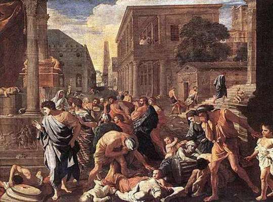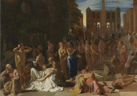 公元前430到前427年,雅典发生鼠疫,近1/2人口死亡,整个雅典几乎被摧毁。由17世纪比利时画家米希尔·史维特斯所绘的《雅典鼠疫》生动地复原了古希腊史学家修昔底德所描述的见闻:“有些病人裸着身体在街上游荡,寻找水喝直到倒地而死。甚至狗也死于此病,吃了躺得到处都是的人尸的乌鸦和大雕也死了,存活下来的人不是没了指头、脚趾、眼睛,就是丧失了记忆……”