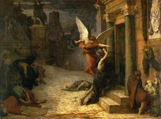 在美术史上,《被瘟疫侵袭的罗马城》是一幅极有代表性的作品,19世纪法国画家居勒·埃里·德洛内为这幅画筹备了12年之久,同时采用了非常文学化的表现手法。他撷取了圣徒塞巴斯蒂安殉道故事中的场景:“之后一位善良天使显现,他指挥一位恶天使手持长矛戳击各家门户,门被戳几下,家里就死去几人。”而这幅画作里描绘的恐怖情景,正是导致拜占庭(东罗马)帝国走向灭亡的开端——查士丁尼瘟疫。