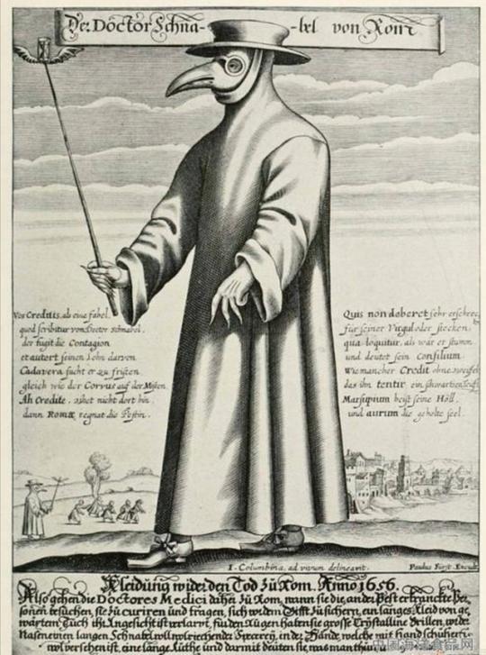 这次新冠病毒感染肺炎在中国爆发之初,很多相关新闻总是和口罩与防护服牵扯在一起,文艺复兴时期的画家保罗-福斯特作于1656年的作品《Doctor Beak from Rome》则是世界上最早描绘了口罩和防护服的画作。这幅画反映了中世纪时,黑死病横行欧洲,当时的医生为了杜绝感染而穿戴的鸟嘴防护服,这是人类开始寻求科学防治的尝试。