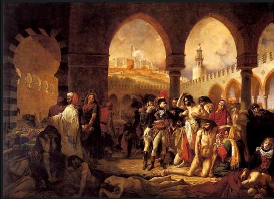 还有一幅关于瘟疫的名画能载入史册,这幅名为《拿破仑视察雅法鼠疫病院》是画家安·让·格罗根据1799年拿破仑东征叙利亚途中的史实制作的。雅法城是当时叙利亚的军事要地,在激战中,法军遍染鼠疫。拿破仑为此下令,所有骑兵在行军中一律下马,并身先士卒,徒步行军,以让出足够的马匹来运载病号与伤员,并将重病患者安排住院治疗。这幅画就是表现拿破仑和他的部属亲临病院探视士卒的情景。