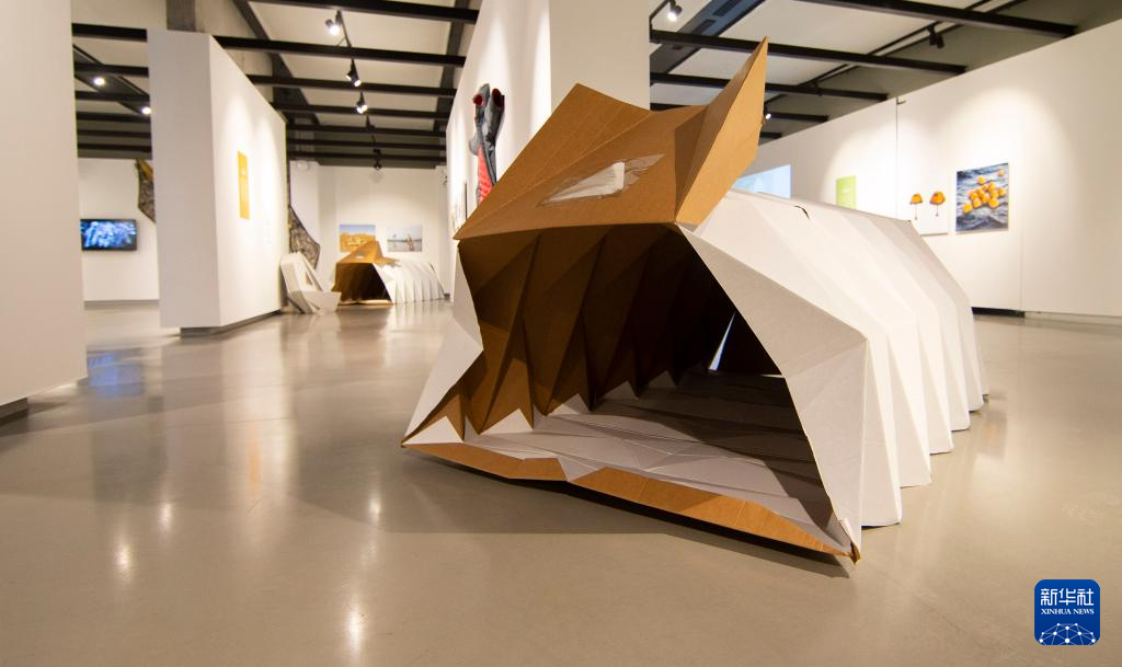 这是11月13日在加拿大多伦多举行的“生存建筑与应对的艺术”展览上拍摄的一件可折叠纸板庇护所。一场名为“生存建筑与应对的艺术”的展览正在多伦多举行,展出一批融合科学、技术、建筑和艺术等元素以应对气候变化的建筑相关设计作品。新华社发(邹峥摄)