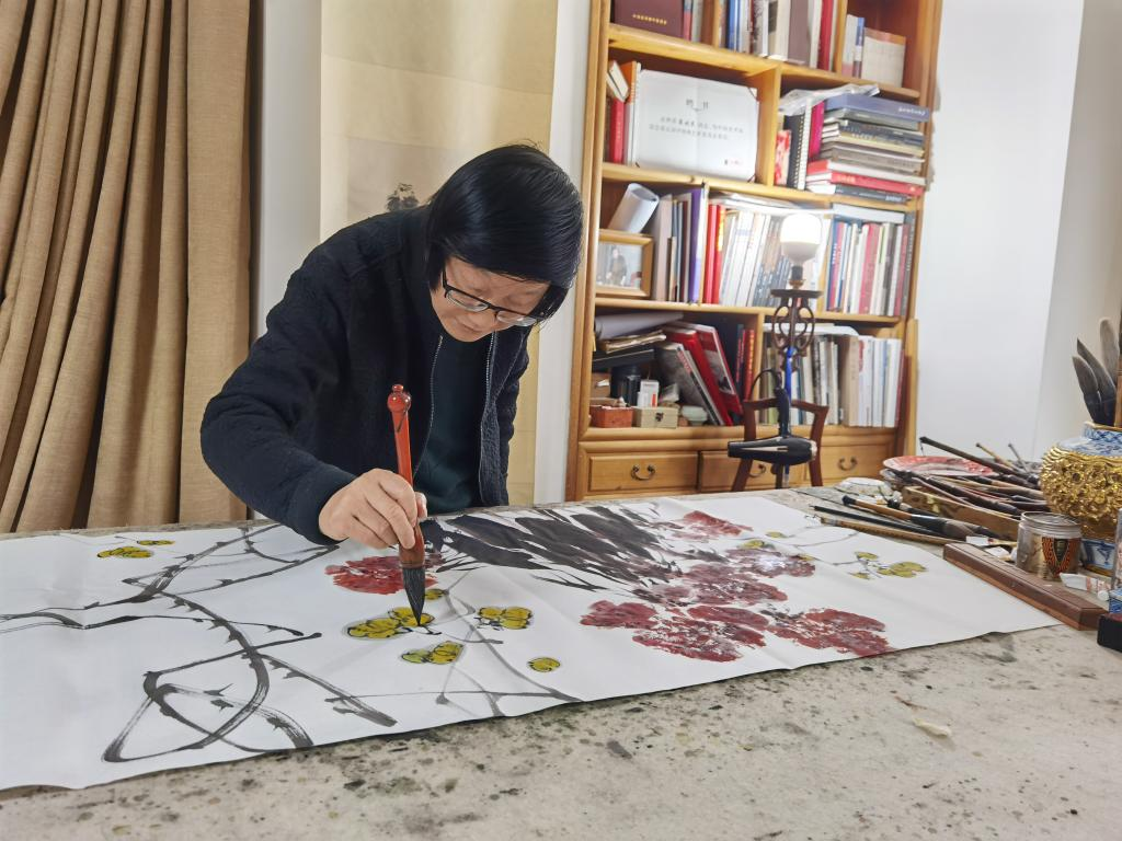 离开的时候,梁时民又去到案前继续他的画作。“我打算在鸡冠花的周围添一些金黄的果实,希望我们的运动健儿、冬奥选手能够硕果累累。”